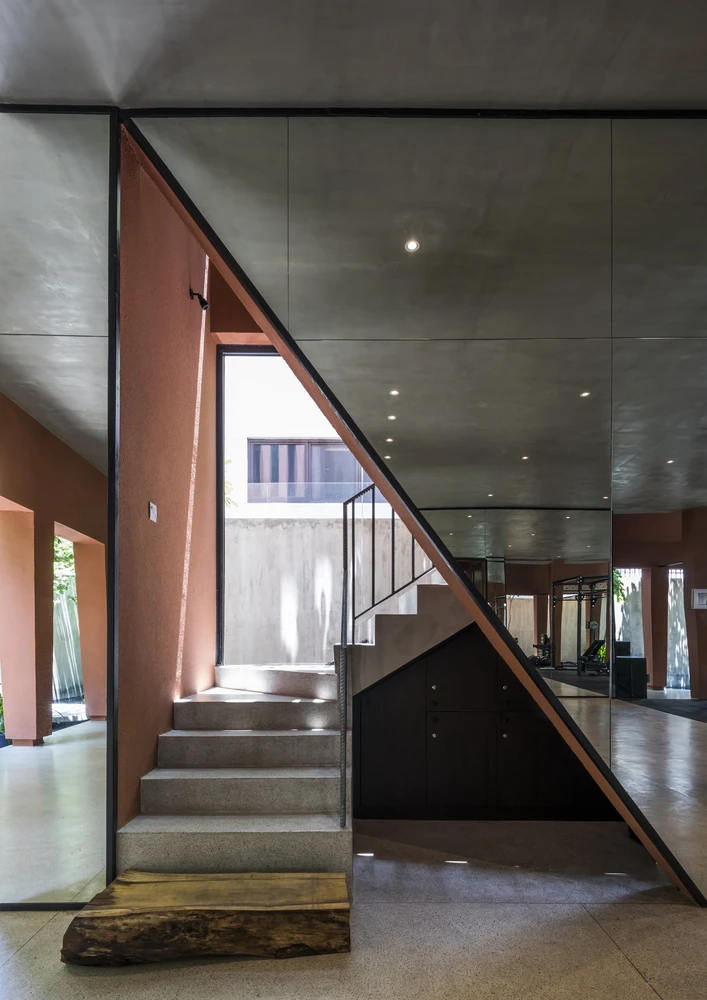 Cầu thang từ phòng yoga, gym được thiết kế cách điệu, tạo nên sự thu hút ở khu vực luyện tập này.