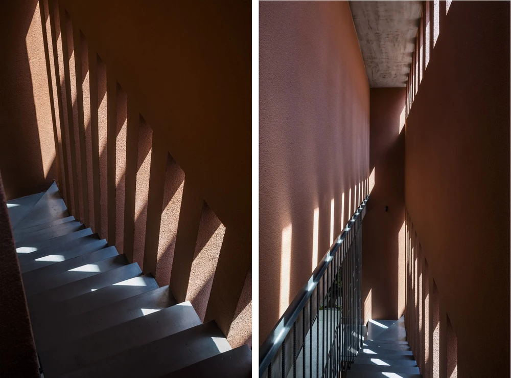 Cầu thang dẫn lên các tầng thoáng mát bởi ánh sáng có thể xuyên qua khe hở trên tường.