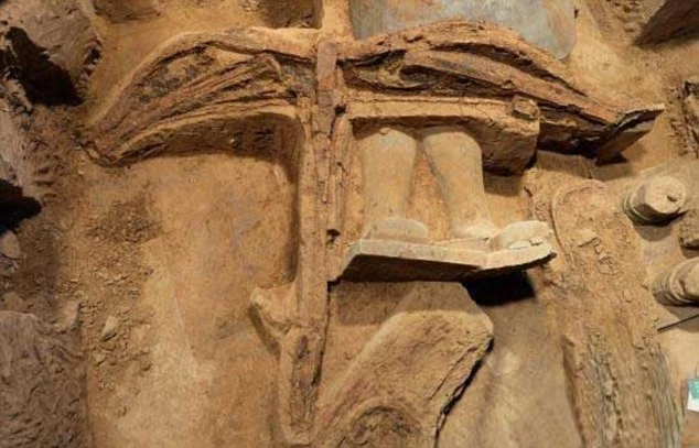 Chiếc nỏ, được chôn nổi lên mặt đất bên cạnh những bức tượng đất nung, được phát hiện bởi các nhà khảo cổ làm việc tại khu di tích này.