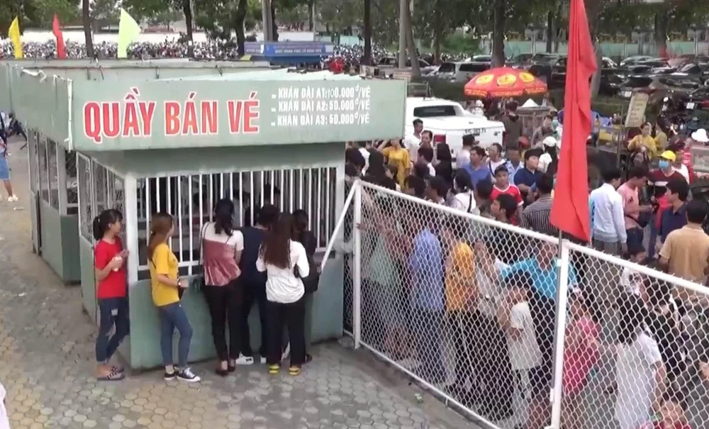 Khán giả sân Bình Dương chen chúc mua chiếc vé vào sân. Ảnh: BTN