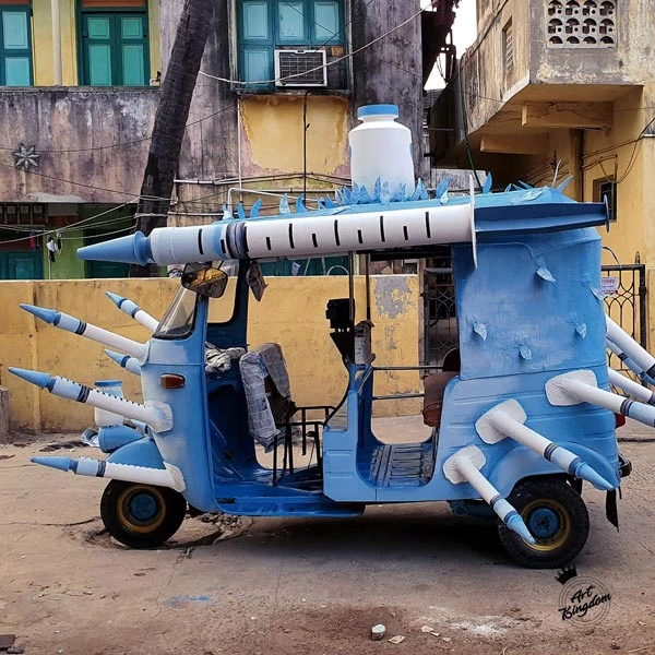 Nghệ sĩ Goutham, người sáng lập công ty nghệ thuật Art Kingdom tại Ấn Độ, đã thực hiện thiết kế chiếc xe kéo từ ống phế thải, chai nhựa cũ và các vật liệu bỏ đi khác.