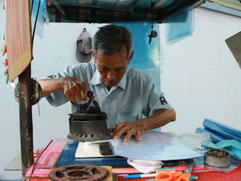 Những người cần ép nhựa giấy tờ, họ cũng như tôi, thường phải đến buổi sáng vì bác làm đến khoảng giờ trưa thì nghỉ. Đều đặn 6 giờ sáng bác Vòng đạp xe từ quận 4 và đến góc đường quen thuộc. Bên tủ đồ nghề, có khách đến thì làm việc, không có khách thì bác ngồi ngắm phố phường. Khách của bác Vòng thường là khách quen (trong đó có tôi). Họ đến ép giấy tờ và trong khi nhìn bàn tay chai sần của bác - tai nạn của những lúc bỏng - đẩy bàn ủi lướt nhẹ trên tờ giấy mỏng có tác dụng không để mặt bàn ủi trực tiếp lên nhựa dẻo thì họ với bác cùng nhau luận bàn thiên hạ sự. Sướng nhất là buổi sáng vì trời còn mát. Nhưng khi nắng lên thì bác phải chịu đựng những cơn nắng rát da vì tấm mái che nhỏ của cái bàn ép nhựa không đủ sức che nắng thì làm gì nói đến che mưa. Tuy vậy, dù trời mưa hay nắng, bác Vòng không để thời tiết ảnh hưởng đến chất lượng của từng đường ép. Đôi lúc nhìn bác cầm cái bàn ủi than con gà nóng hừng hực lướt nhẹ nhưng rất cẩn thận để làm vui lòng khách đến, vừa lòng khách đi… Chỉ một cái xe nhỏ nằm khép nép bên hông trụ sở dân phòng, không gây cản trở lối đi của người đi bộ - nếu có gây trở ngại thì chính là cái trụ sở, suốt 40 năm qua bác Vòng đã nuôi sáu người con khôn lớn.