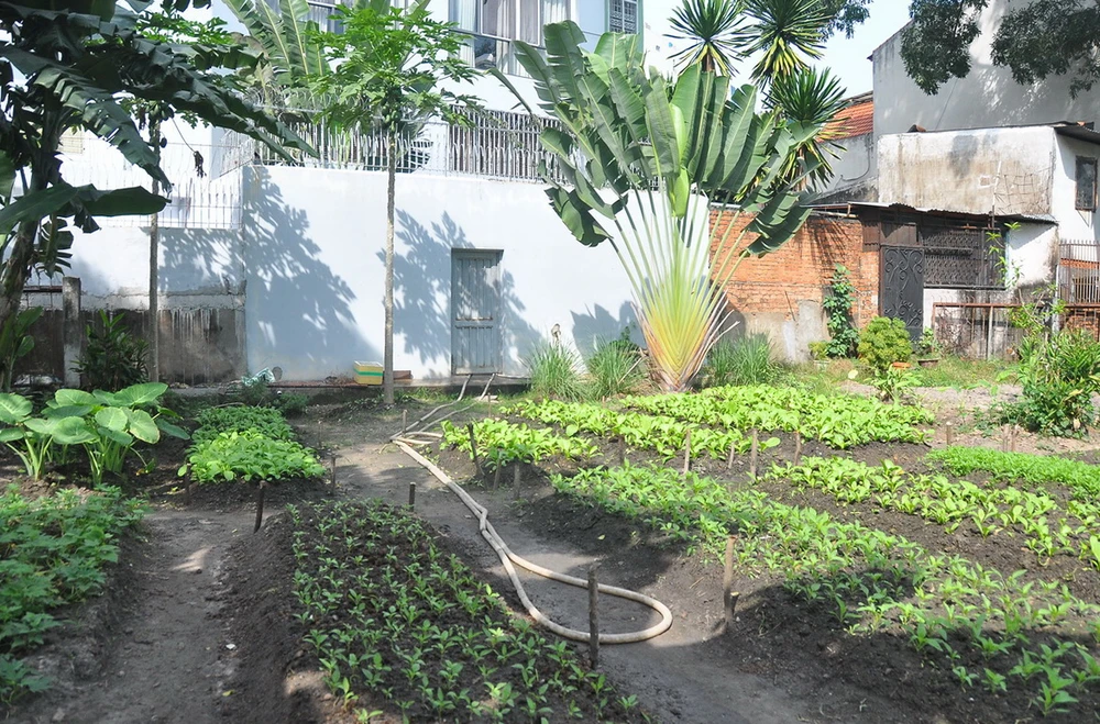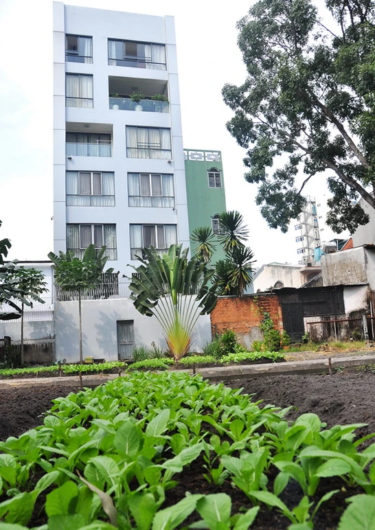 Căn nhà này đã trổ cửa ra công viên để vào “vườn rau” và trên các tầng lầu được thiết kế cách mở tối đa cửa sổ có thể để hướng về không gian phía công viên Gia Định, trong đó có những luống rau. Ảnh: MP