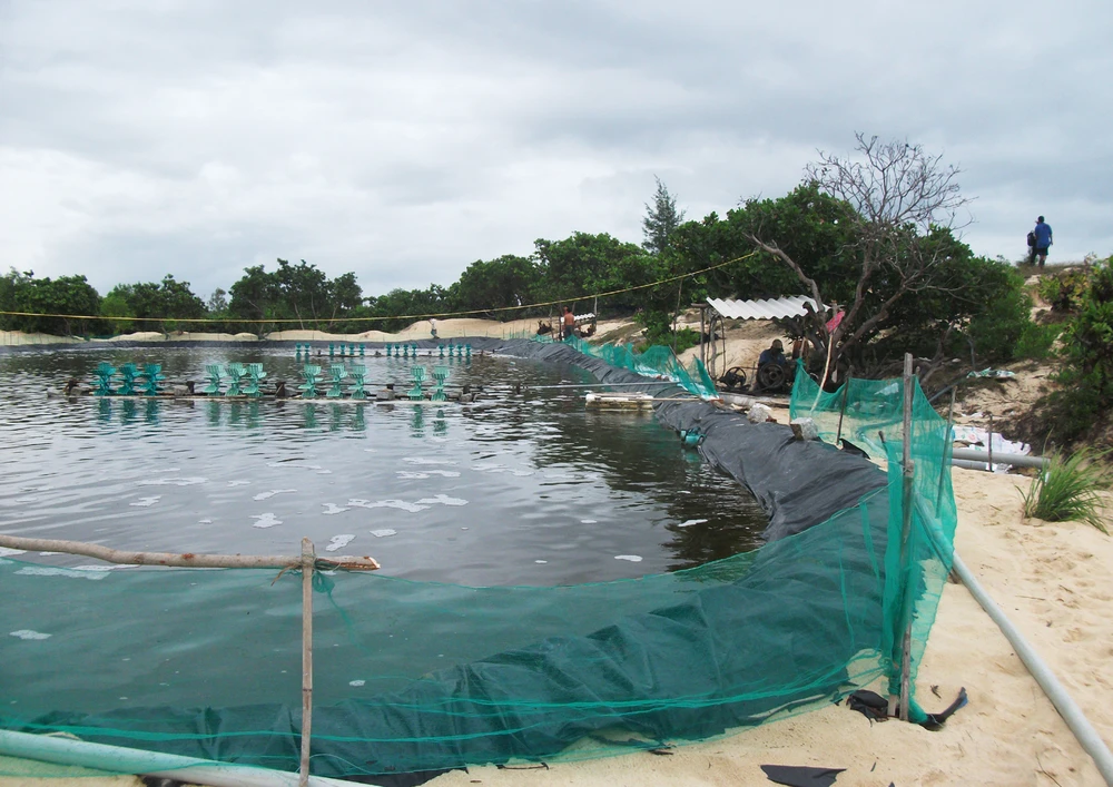 Một hồ nuôi tôm lấn chiếm trái phép đất rừng phòng hộ ven biển tại thôn Giai Sơn, xã An Mỹ. Ảnh: TẤN LỘC