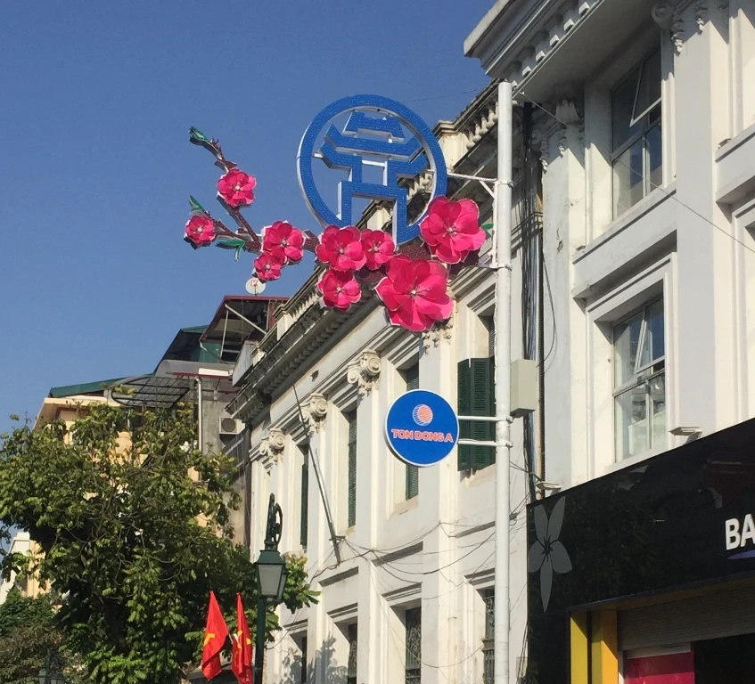 Tác phẩm Hà Nội đón xuân được trang trí trên đường Tràng Tiền.