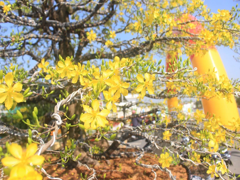 Anh Cường cho biết thêm, điểm độc đáo của cây mai này là được uốn tỉa cành hoa tạo cành tứ diện từ gốc đến ngọn. Cây được uốn tỉa lắt léo, rất tỉ mỉ công phu, tàn cây phủ đều hình cây thông rất đẹp. Đặc biệt bông nở đúng vào dịp tết, trổ đều và rất sung.