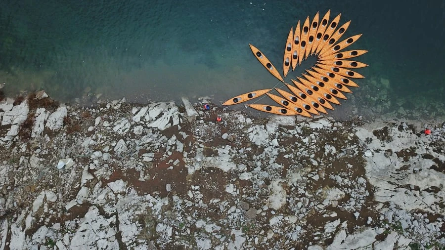 Những chiếc thuyền kayak neo đậu trên sông Jiangjie ở quận Weng'an, nằm ở phía Tây Nam tỉnh Quý Châu của Trung Quốc được sắp xếp thành hình ngẫu nhiên thích mắt. Ảnh: ZUMA PRESS