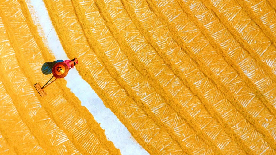 Một người nông dân đang cào lúa trong một mùa bội thu đầu tháng 9 tại tỉnh Hồ Nam, Trung Quốc. Ảnh: ZUMA PRESS