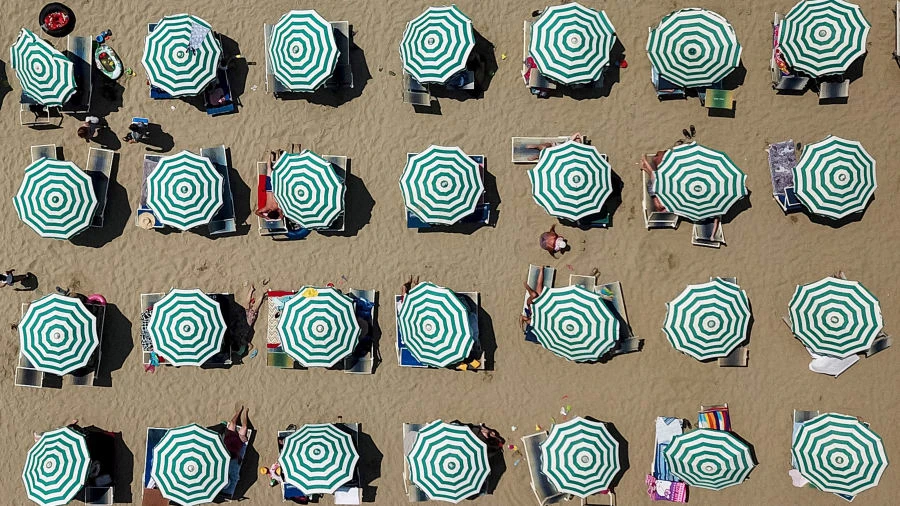 Bãi biển ở TP cảng Durrës ở Albania được chụp từ trên cao cho thấy những chiếc dù được sắp xếp thẳng tắp thích mắt. Ảnh: GETTY