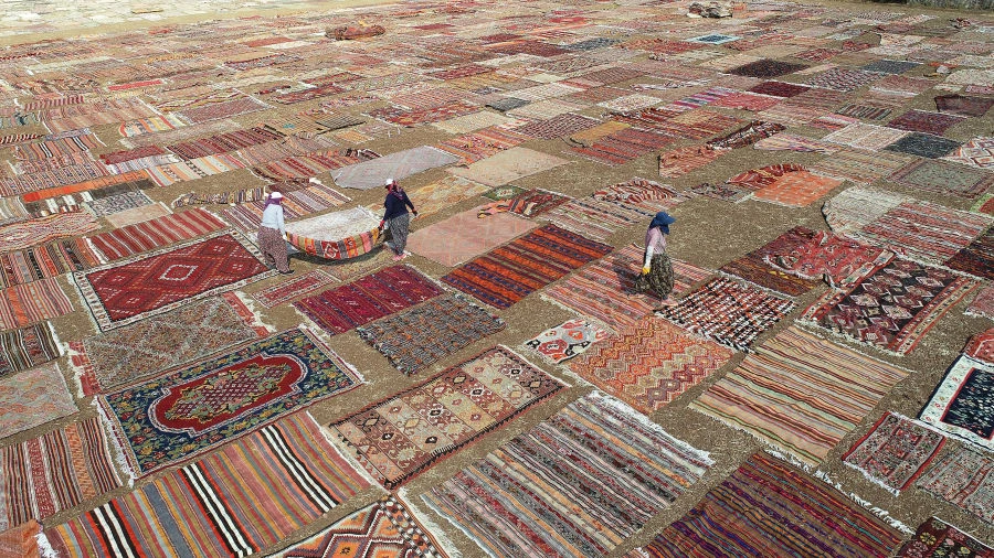 Người dân ở Antalya, Thổ Nhĩ Kỳ phơi những tấm thảm mới đan xong để tăng màu cho thuốc nhuộm. Ảnh: SHUTTER STOCK