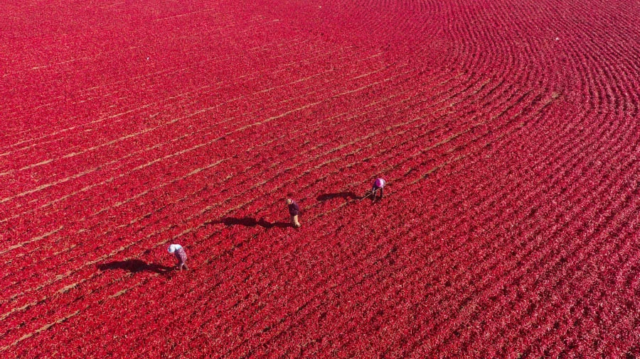 Những dãy ớt trải dài màu đỏ tuyệt đẹp trong một mùa vụ thu hoạch ở tỉnh Tân Cương, Trung Quốc. Ảnh: CHEN YANG/SIPA ASIA