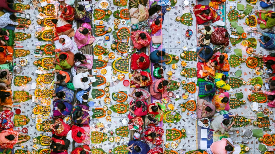 Các tín đồ đạo Hindu ngồi cùng nhau trong một ngôi đền để quan sát lễ kỷ niệm Rakher Upobash ở Dhaka, Bangladesh. Những lễ vật đầy màu sắc tạo thành một bức tranh sinh động. Ảnh: GETTY