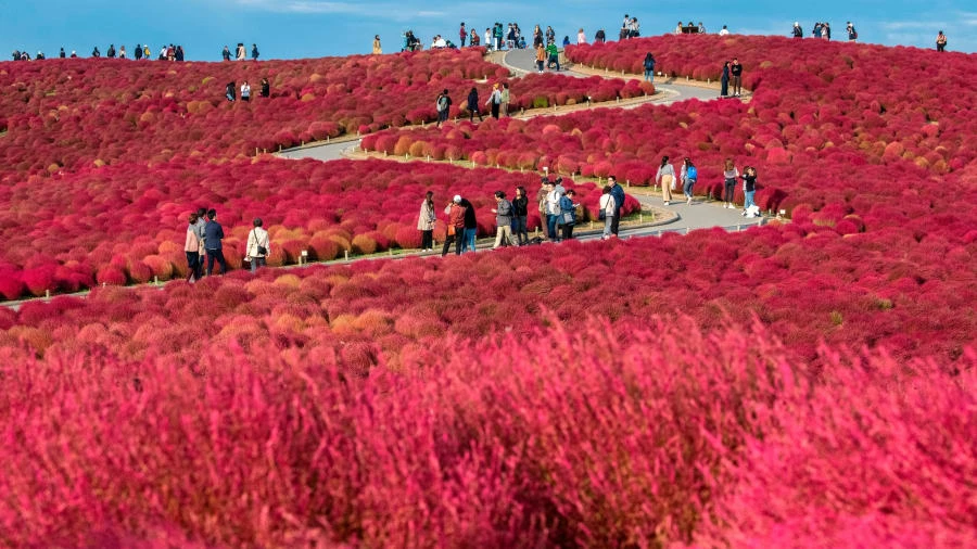 Du khách đi lang thang qua một cánh đồng kochias tại Công viên bờ biển Hitachi ở Katsuta, phía Đông Tokyo. Vào đầu đến giữa tháng 10, cỏ kochias chuyển từ màu xanh sang đỏ, thu hút đông đảo khách tham quan. Ảnh: GETTY