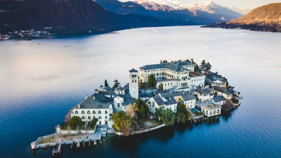 Mặt trời lặn ở Isola San Giulio (đảo St Julius) trên hồ Orta ở miền Bắc Ý. Ảnh: ALESSANDRO/ PACIFIC PRESS