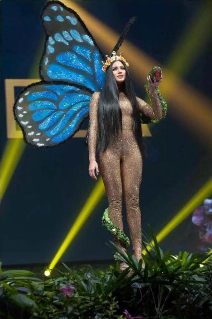 Trang phục dân tộc ấn tượng của hoa hậu Venezuela lấy cảm hứng từ loài bướm và tắc kè hoa.