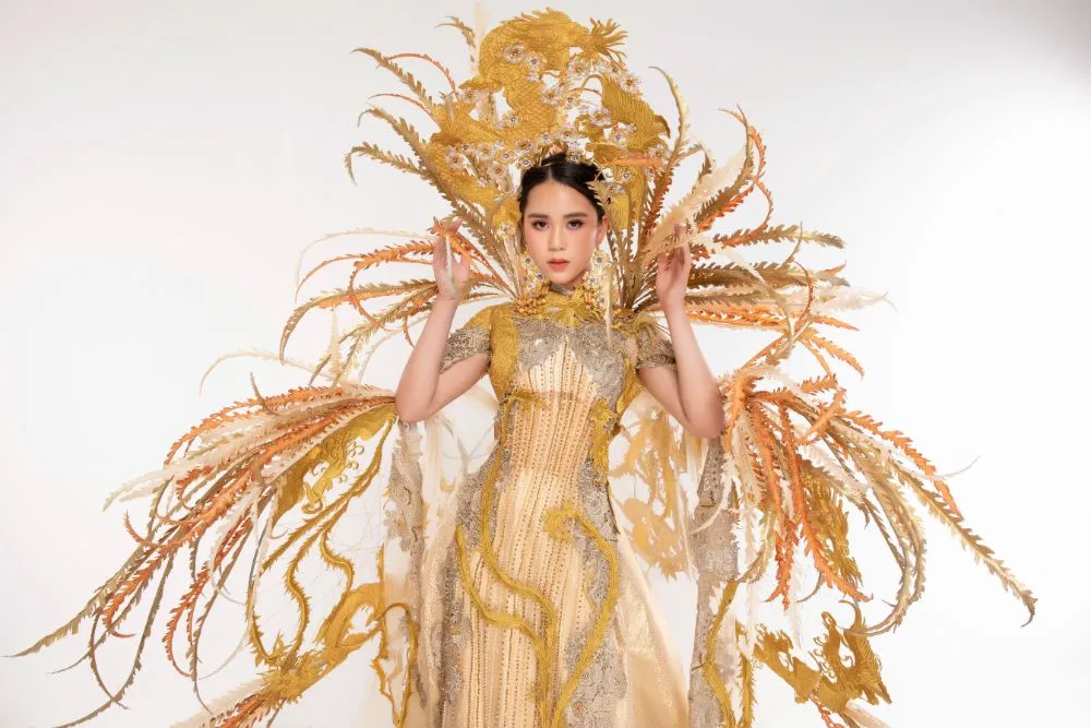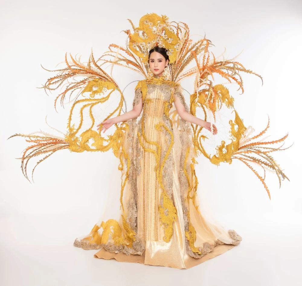 Trang phục được thực hiện với kỹ thuật kết hạt thủ công tạo nên từ những hạt pha lê lấp lánh, thể hiện sự cần mẫn, tinh thần chịu thương chịu khó của người phụ nữ Việt. Kết hợp với nghệ thuật thêu từ sợi kim tuyến tạo nên sự nổi bật và hiệu ứng ánh sáng cho bộ trang phục. Đôi cánh được tạo nên từ ba vòng tròn từ lớn đến bé như hình ảnh người cha, người mẹ ôm ấp chở che đứa con bé nhỏ của mình…