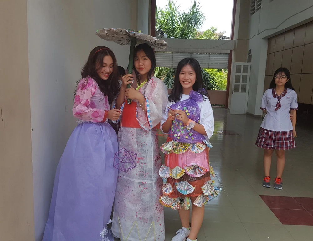 Những bộ áo dài thướt tha, những chiếc đầm dạ hội xinh xắn, những bộ đồ thời thượng... đều được các em thiết kế từ những vật liệu tái chế.