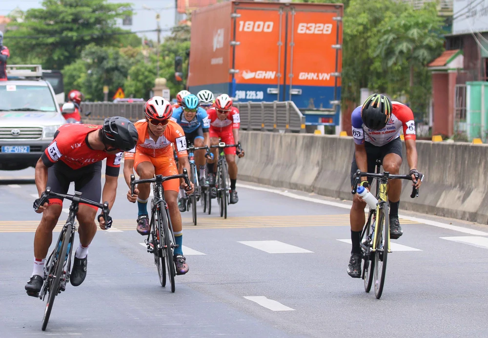 Áo vàng Nguyễn Tấn Hoài bị các đối thủ kìm kẹp trên đường đua. ẢNH: HUỲNH VĂN THUẬN