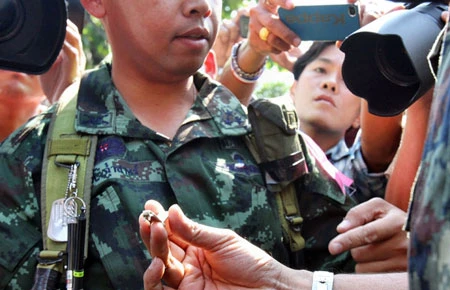 Các binh sĩ cho xem các mảnh vỡ được cho là mảnh lựu đạn M26 tìm thấy trong vụ nổ ở đường Banthat Thong ngày 17-1. ảnh: BANGKOK POST