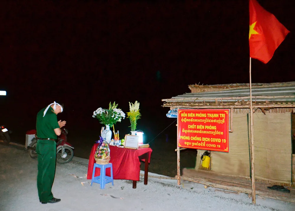 Bàn thờ nhỏ, đơn sơ với lọ hoa tươi, trái cây, bát nhang… được lập vội ngay trước lán anh em đang đóng quân. Người lính biên phòng mang khăn tang trắng lặng lẽ cúi đầu tiễn biệt, xin cha tha thứ vì không thể trở về gặp cha lần cuối. Dịch bệnh đang diễn biến phức tạp, chưa kể đến nếu trở về khả năng sẽ mang thêm mối lo cho gia đình.