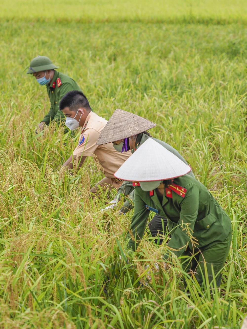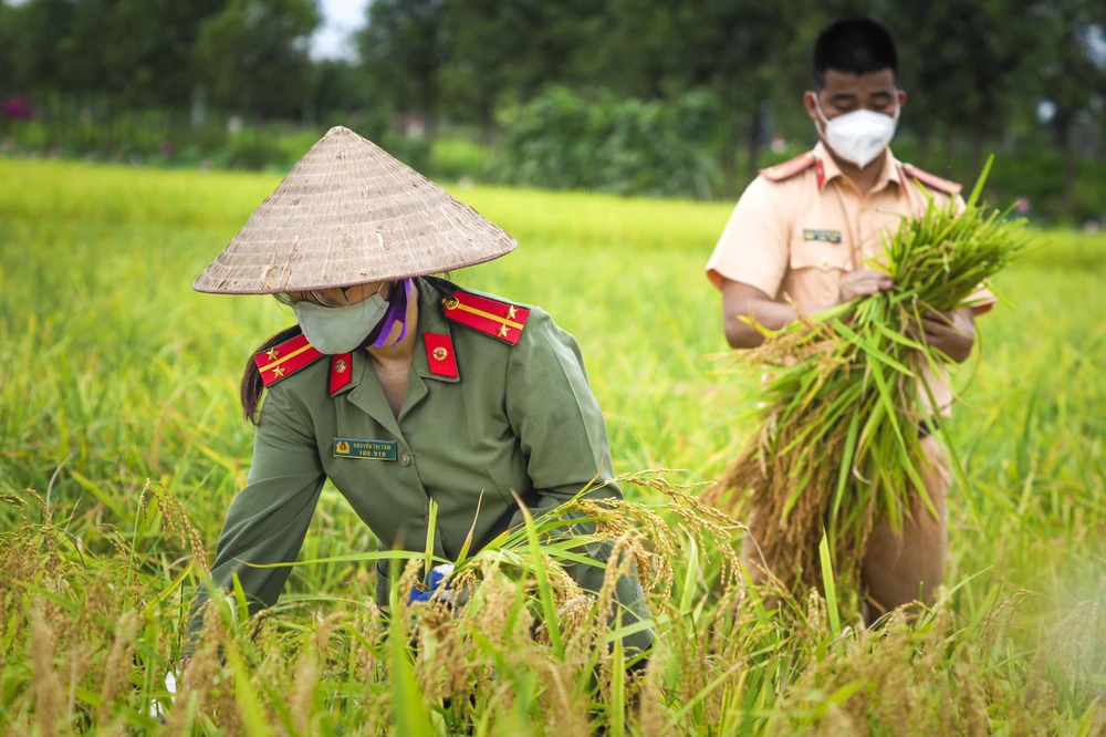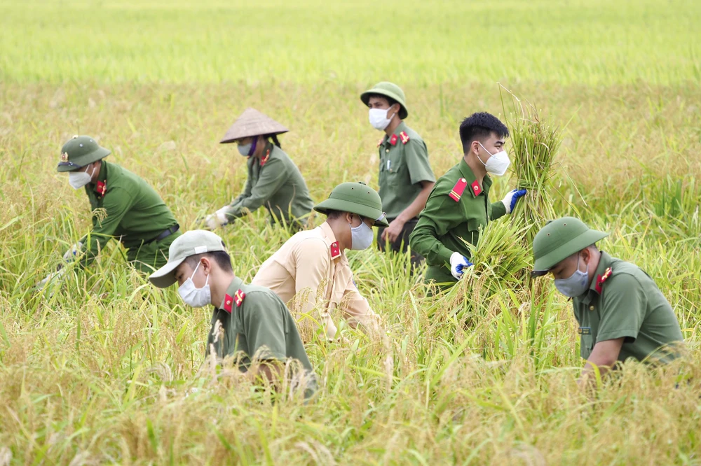 Từ 6 giờ sáng, ngày 5-6, các chiến sĩ công an đã chia nhau đến các ruộng của những hộ dân cần giúp thu hoạch. Trong đoàn còn có cả nữ chiến sĩ công an cũng tham gia công tác này. Trung úy Nguyễn Thị Tâm thoăn thắt đưa những đường lưỡi hái, cắt gọn gàng những bông lúa chín.