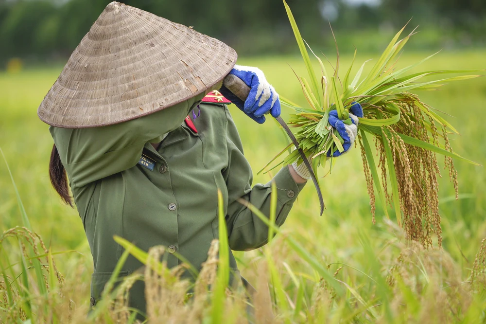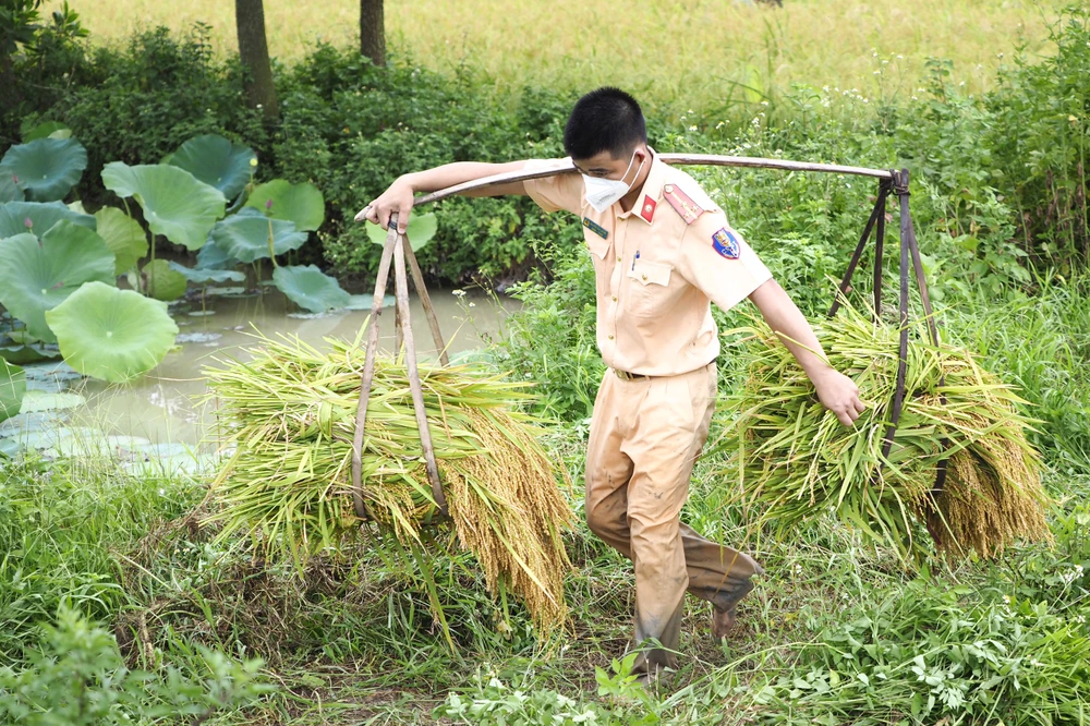 Thượng uý Nguyễn Văn Hải nhanh tay ôm bó lúa vừa mới gặt xong và mang lên bờ. Được biết, trước đó ngày 4-6, các chiến sĩ Công an huyện Yên Dũng được tiêm vaccine COVID-19, hôm sau khi ra đồng hầu hết các anh ai cũng mệt và sốt nhưng vẫn cố gắng giúp bà con nông dân.