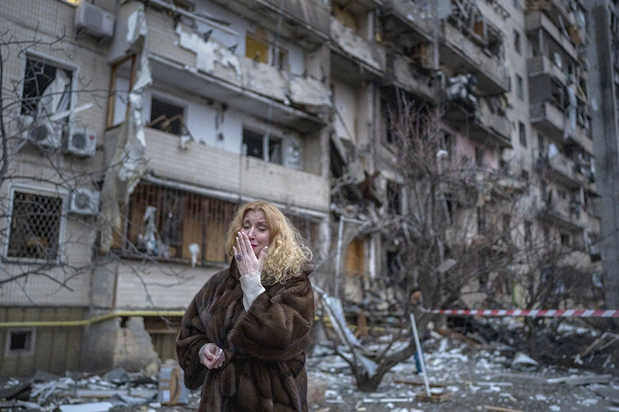 Một phụ nữ trước tòa chung cư ở thủ đô Kiev bị trúng đạn pháo của Nga