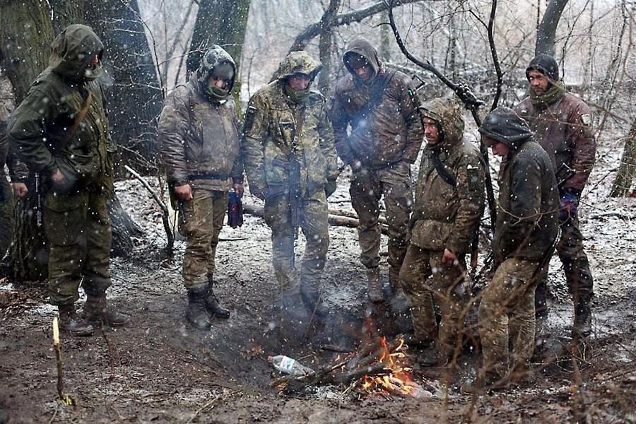 Quân đội Ukraine đốt lửa sưởi ấm ở vùng Luhansk (đông Ukraine) ngày 3-3. Ảnh: AFP/GETTY IMAGES