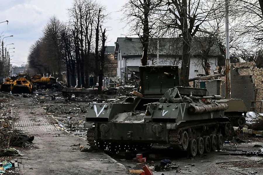 Xe bọc thép Nga bị phá hủy ở TP Bucha, phía tây thủ đô Kiev (Ukraine)