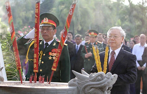 Tổng Bí thư Nguyễn Phú Trọng dâng hương tưởng niệm tại Nghĩa trang liệt sĩ TP.HCM. Ảnh: HOÀNG TRIỀU