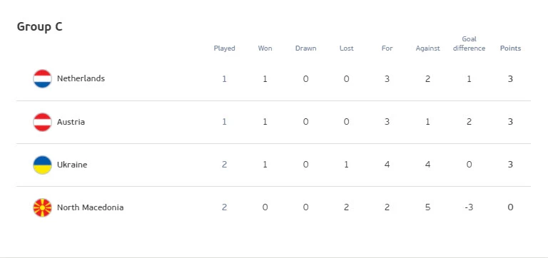 Như vậy, cục diện của bảng C Euro 2020 như sau Hà Lan và Áo cùng 3 điểm mới đá 1 trận, Ukraine cũng có 3 điểm nhưng đã thi đấu 2 trận, còn Macedonia sau 2 trận trắng tay chưa có điểm nào.