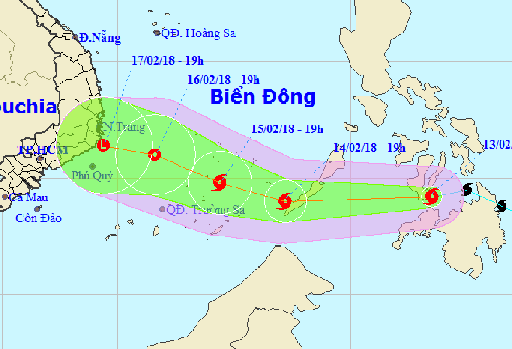 Trong 48 đến 72 giờ tiếp theo, bão di chuyển theo hướng Tây Tây Bắc, mỗi giờ đi được 10-15km và suy yếu dần thành áp thấp nhiệt đới. Đến 19 giờ ngày 16-2, vị trí tâm áp thấp nhiệt đới cách bờ biển các tỉnh từ Khánh Hòa đến Bình Thuận khoảng 310km về phía Đông. Sức gió mạnh nhất ở vùng gần tâm áp thấp nhiệt đới mạnh cấp 7 (50-60km/giờ), giật cấp 9.