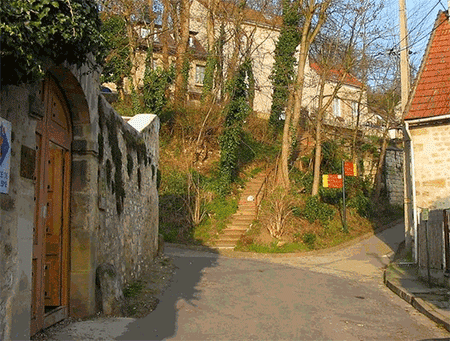 Cảm nhận ngập tràn từ ga vào đến đây, nơi nào đã vào tranh của Van Gogh, nơi đó trở thành bất tử. L’Escalier d’Auvers vẽ cảnh cuối đường Sansonne có một ngã ba dẫn lên đồi thấp với những bậc thang và năm người phụ nữ đang đi. Một phóng ảnh của bức tranh dựng sát tường hướng về những bậc thang đó cho thấy không chỉ chính quyền mà cả người dân trăm năm qua không hề xâm phạm những bậc thang huyền thoại.