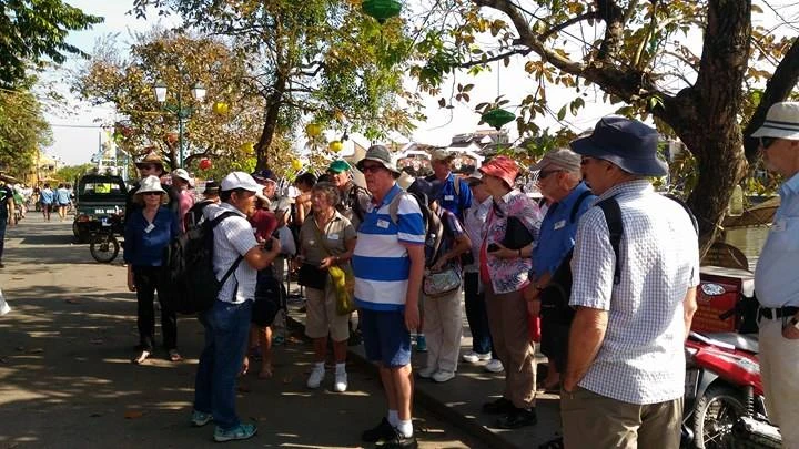 Một nhóm du khách "Tây" đang nghe hướng dẫn viên thuyết trình bên bến sông Hoài.