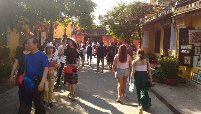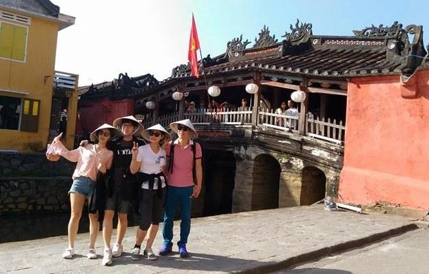 Một nhóm du khách người Trung Quốc đang "tạo dáng" bên Chùa Cầu.