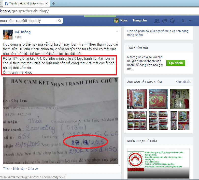 Một chiêu lừa khác không kém phần “khó đỡ” là việc sửa ngày tháng giao hàng trên hợp đồng. Tài khoản Facebook Hệ Thống cho biết bị một phụ nữ tên Thanh Trúc lừa thêu 5 bức tranh. Trong hợp đồng ghi ngày giao tranh là 17/4 nhưng không biết vì sao sau đó đã biến thành ngày 7/4. Chủ facebook Hệ Thống bị “kết tội” giao tranh trễ 10 ngày nên mất luôn tiền cọc của cả 5 bức tranh.