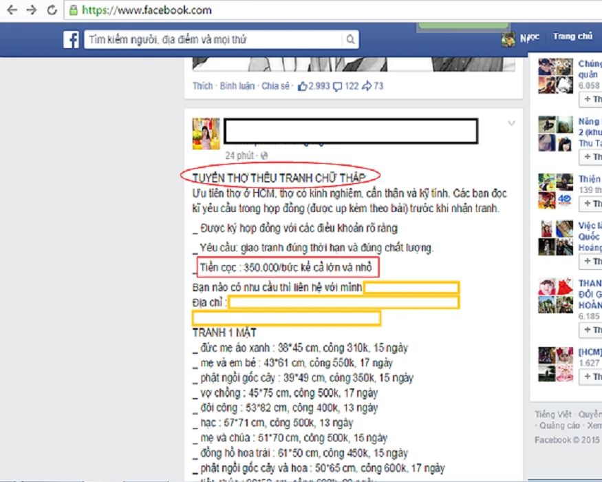 Những thông tin tuyển thợ thêu tranh được đăng tải trên facebook. Ảnh chụp từ màn hình