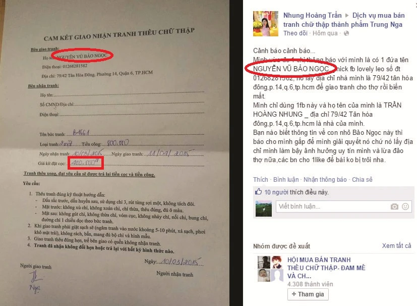 Lời tố cáo cùng tờ hợp đồng giả địa chỉ nhà của Nhung Hoàng Trần trên facebook