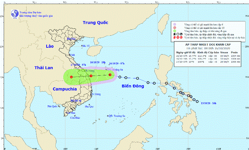 Theo Trung tâm Dự báo Khí tượng thủy văn quốc gia, lúc 7 giờ sáng nay (16-10), áp thấp nhiệt đới (ATNĐ) đang ở ngay trên vùng biển phía nam quần đảo Hoàng Sa, cách bờ biển Đà Nẵng-Bình Định 360km.