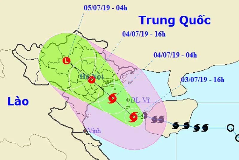 Đến 16 giờ chiều nay (4-7), vị trí tâm áp thấp nhiệt đới ở trên đất liền các tỉnh đồng bằng Bắc bộ. Sức gió mạnh nhất vùng gần tâm áp thấp nhiệt đới mạnh cấp 6 (40-50 km/giờ), giật cấp 8, sau đó di chuyển theo hướng Tây Tây Bắc, mỗi giờ đi được khoảng 15 km và tiếp tục suy yếu thành một vùng áp thấp trên khu vực vùng núi và trung du Bắc bộ.