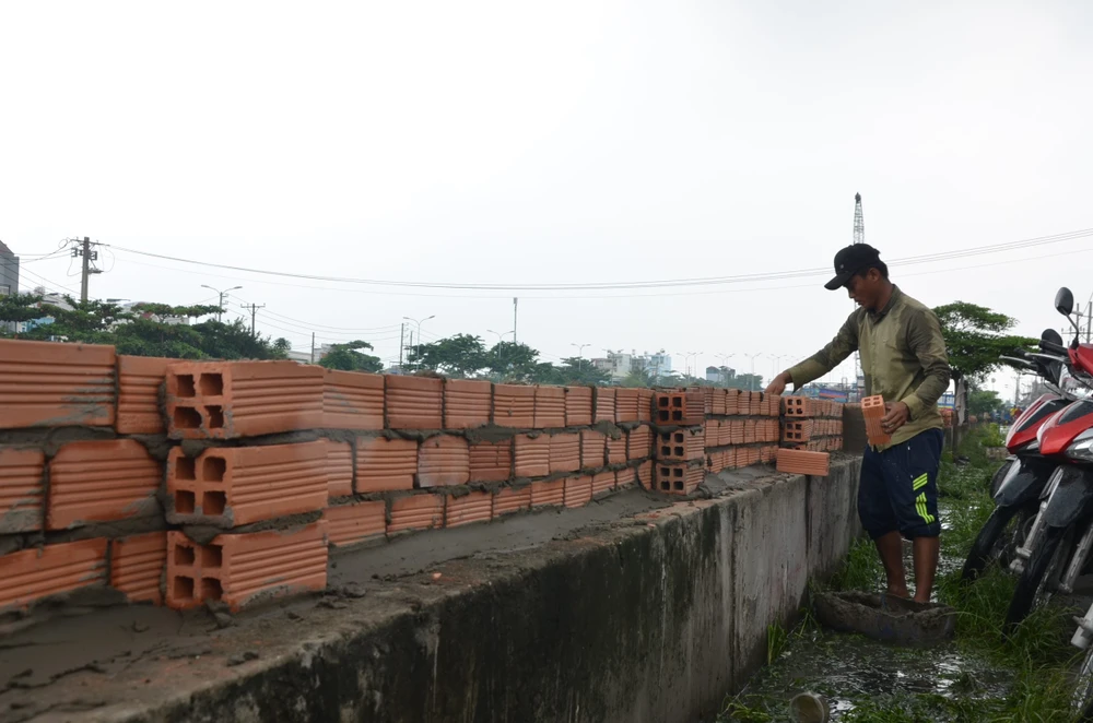 Theo ghi nhận, dọc bờ kênh đường Bến Phú Định, UBND phường 16 (quận 8) cũng tiến hành xây thêm tường gạch dài khoảng 2 km.