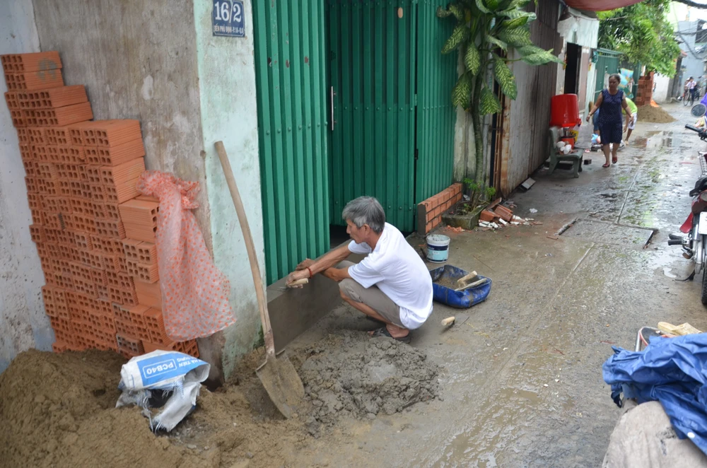 Đến đầu giờ chiều 30-9, rất nhiều người dân trên đường Bến Phú Định (phường 16, quận 8, TP.HCM) vẫn đang xây tường, đắp bao để đối phó với triều cường đang cao vào chiều tối nay và những ngày tới.