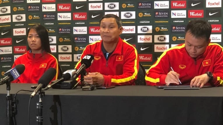 HLV Mai Đức Chung của tuyển Việt Nam cùng đội trưởng Huỳnh Như tại buổi họp báo trước trận Úc-Việt Nam