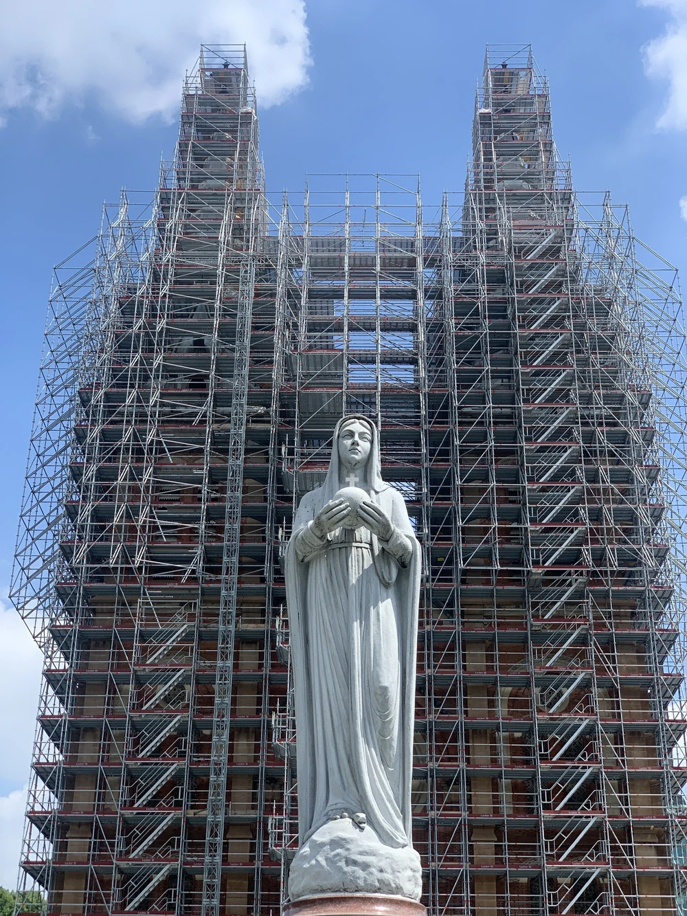 . Riêng phần giàn giáo của tháp chuông lắp từ tháng 6-2020, nó làm người dân luôn chờ đợi không biết khi nào công trình sẽ được gỡ. Vậy theo tiến độ khoảng khi nào phần trùng tu tháp chuông hoàn thành, thưa linh mục?