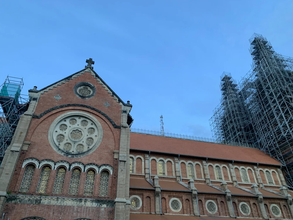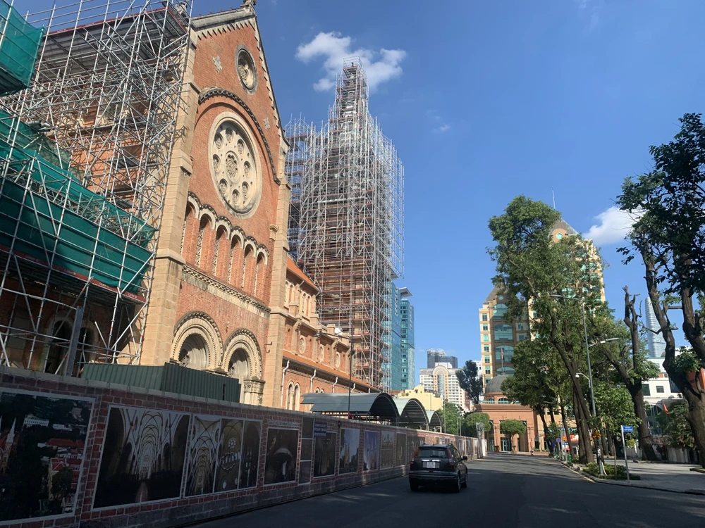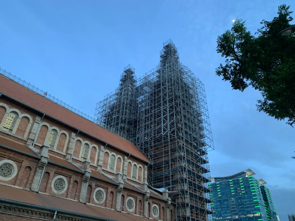 Giàn giáo tháp chuông sẽ hiện hữu ở Nhà thờ Chính toà Đức Bà Sài Gòn nhiều năm nữa. Ảnh: Quỳnh Trang