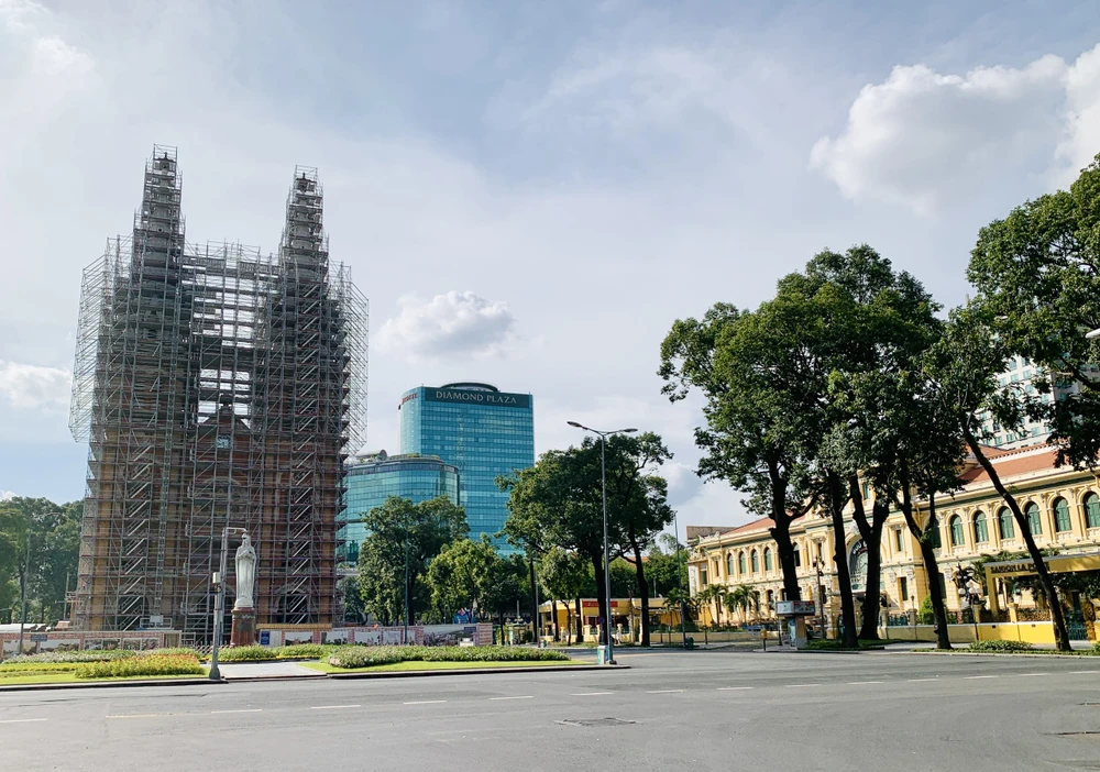 Giàn giáo hai bên hông Nhà thờ đã gỡ từ tháng 5-2020. Ảnh: Quỳnh Trang