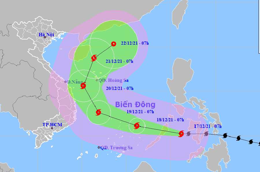 Theo Trung tâm khí tượng thủy văn quốc gia, lúc 7 giờ sáng nay (17-12), vị trí tâm bão RAI ở khoảng 10,2 độ Vĩ Bắc; 121,2 độ Kinh Đông, trên vùng biển phía Tây miền Trung Philippines. Sức gió mạnh nhất vùng gần tâm bão mạnh cấp 14-15 (150-185 km/giờ), giật trên cấp 17.