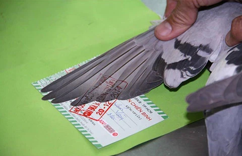 Đóng dấu giáp lai trên cánh chim tại một cuộc đua ở Việt Nam. Ảnh: H.NGUYỄN