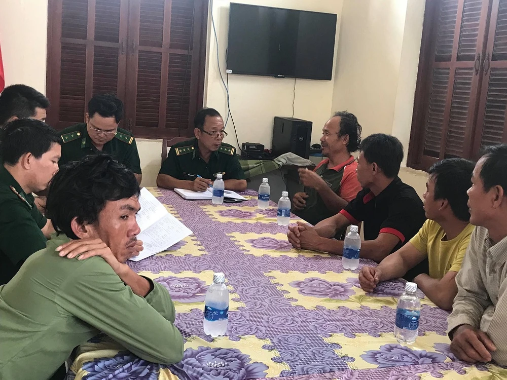 Đồn Biên phòng Long Hòa thăm hỏi, động viên 5 ngư dân được cứu sống an toàn. Ảnh: VĂN HÙNG