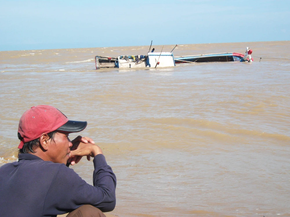 Một tàu cá bị chìm ở cửa biển TP Tuy Hòa (Phú Yên). Ảnh: TẤN LỘC